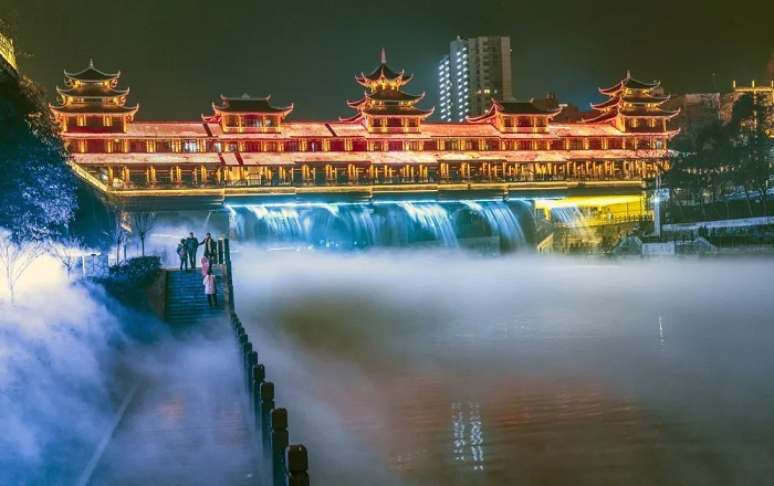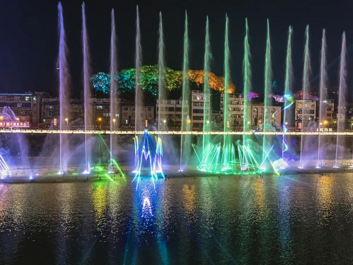 以“清江一脈、造境仙居”為主題的夜景,