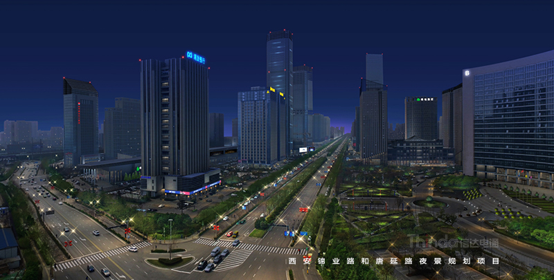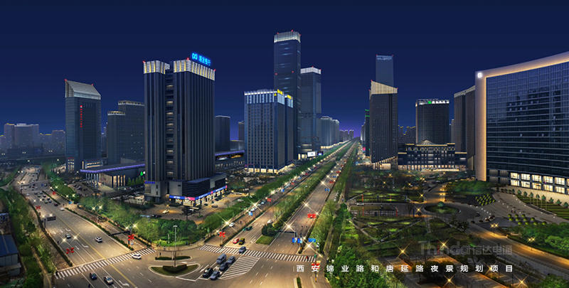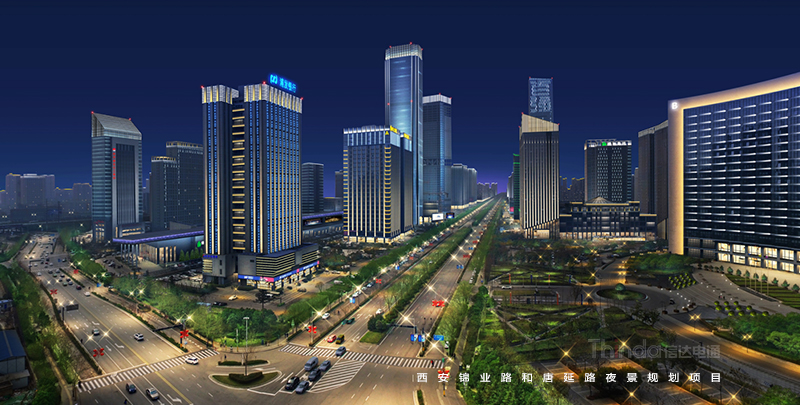 本項為西安高新區(qū)建筑景觀照明規(guī)劃設計中的一部分,地處于唐延路南與錦業(yè)路東交叉口,該視角可見建筑有都市之門、浦發(fā)銀行、綠地智海大廈、綠地筆克國際會展中心、陜西煤業(yè)化工集團、領海大廈、中鐵航空港假日酒店等,是高新區(qū)錦業(yè)路南端的重要位置,當車輛、行人抵達該位置時,視角寬闊夜晚可視范圍大,夜幕下的燈光也就更為重要。