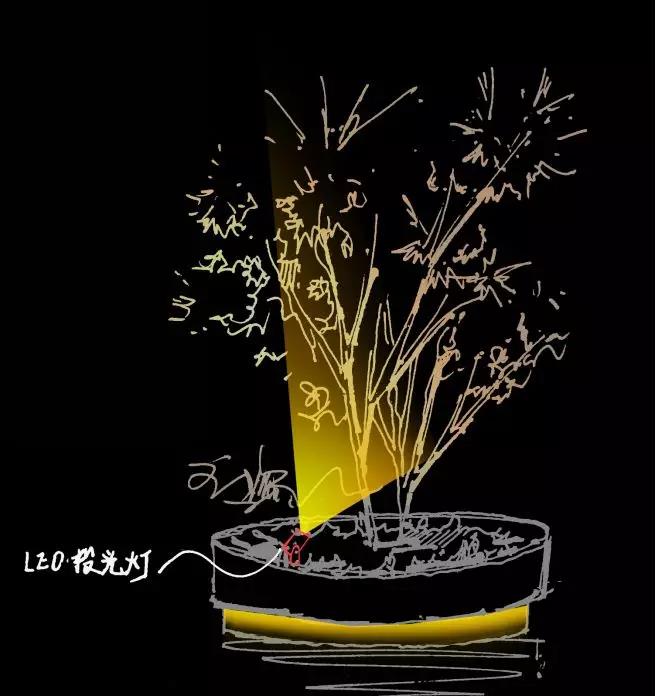 綠植景觀柱依據(jù)其構(gòu)造,進(jìn)行分層照射,在燈具上采用小型投光燈將基座和頂部綠植部分分層打亮,頂部架投影燈營(yíng)造氛圍照明;