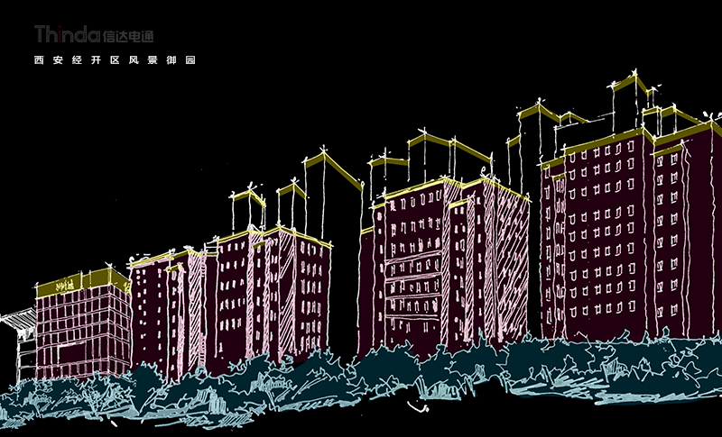 風(fēng)景御園位于西安市經(jīng)開區(qū)鳳城八路,在市政府對面,本項為商業(yè)辦公樓夜景照明設(shè)計,建筑的立面材質(zhì)為淺色石材為主。四棟建筑的建筑形態(tài)相同,沿縱向結(jié)構(gòu)游走,整體造型簡潔、大氣,本項屬于高層建筑。